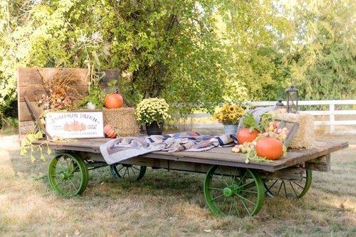 This old 1920 John Deere hay wagon is a classic. It is placed in front of trees that will be turning beautiful fall colors next month and decorated with straw bails, pumpkins, fall flowers and much more.